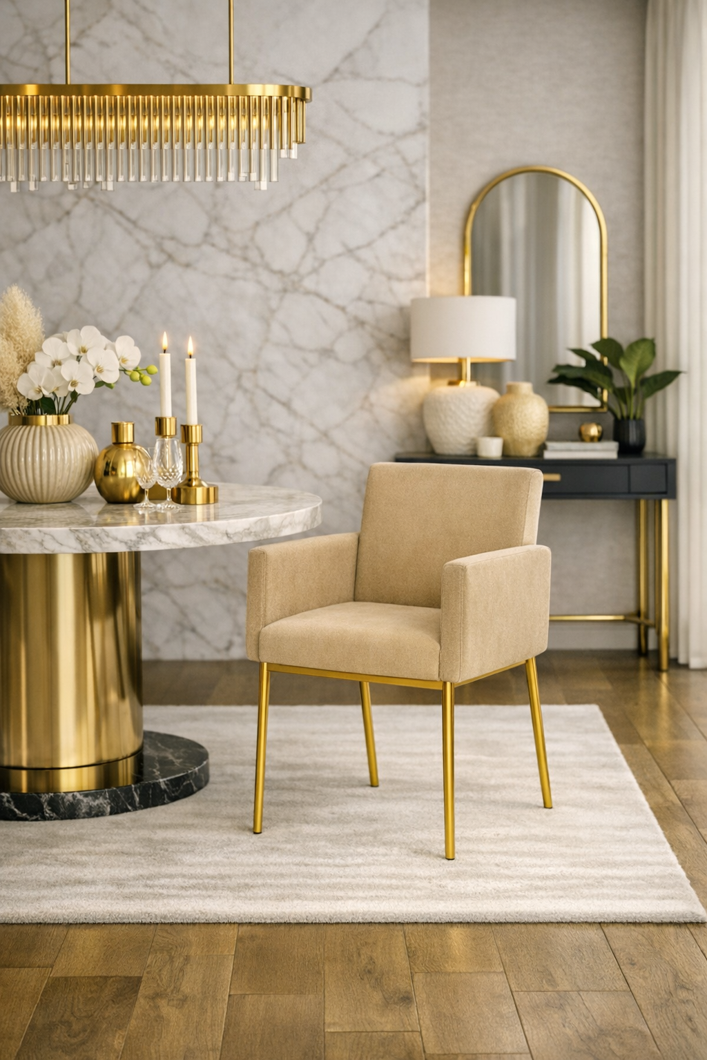 luksusowa aksamitna tkanina o miękkiej, gładkiej strukturze stabilna podstawa w kolorze złotym elegancki design w stylu glamour / modern classic wygodne, profilowane oparcie idealne do salonu, jadalni, toaletki lub przestrzeni komercyjnych świetnie komponuje się z drewnem, marmurem, złotem i czernią