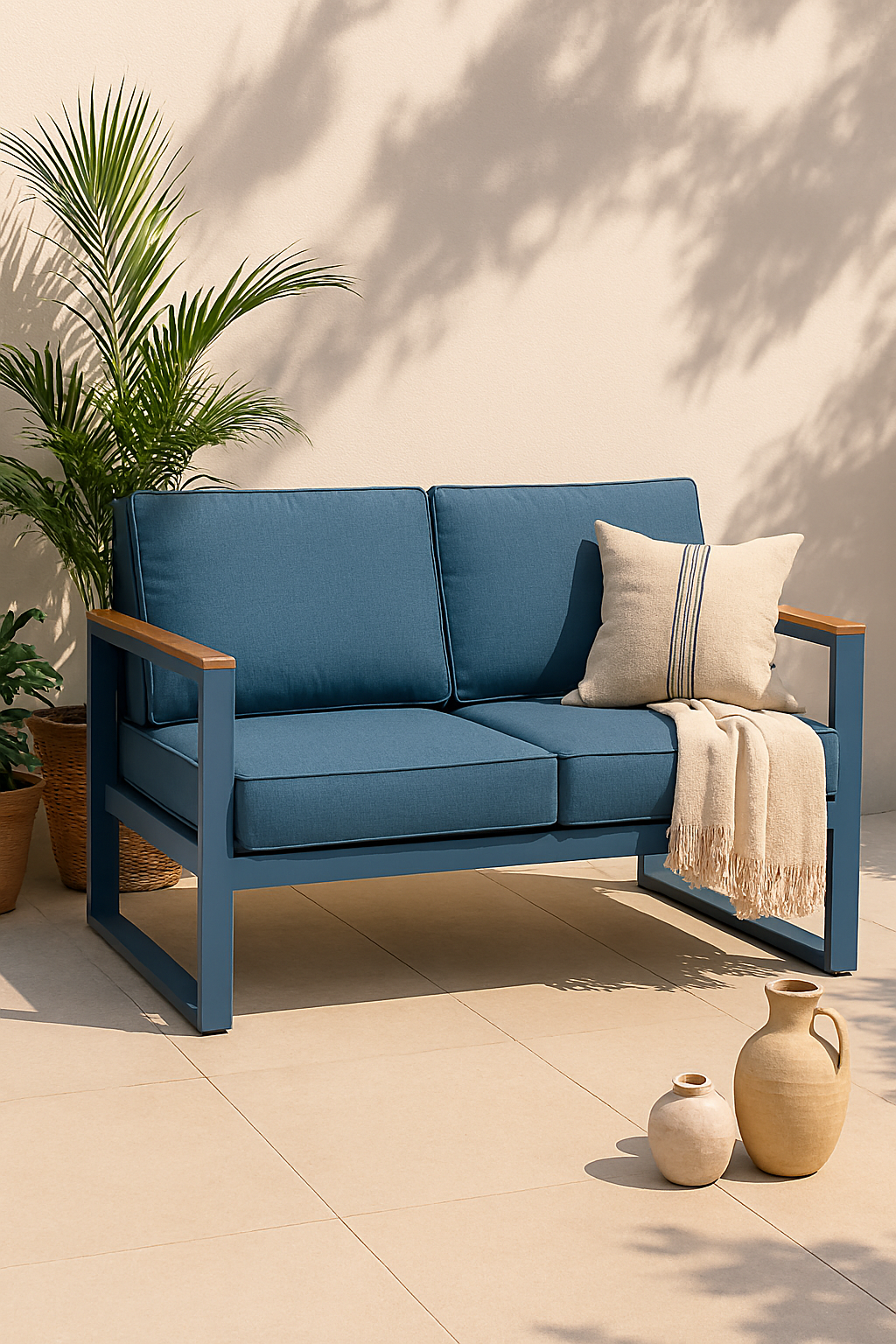 Subtelny, lekko chłodny odcień błękitu nadaje zestawowi wyjątkowej lekkości i harmonii, idealnie wpisując się w aktualne trendy outdoor living.