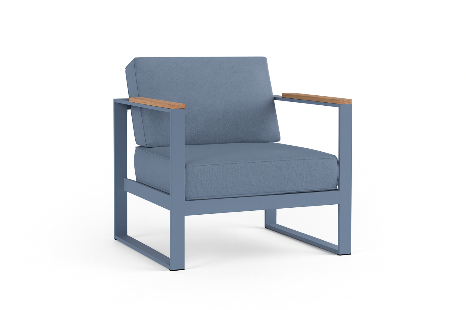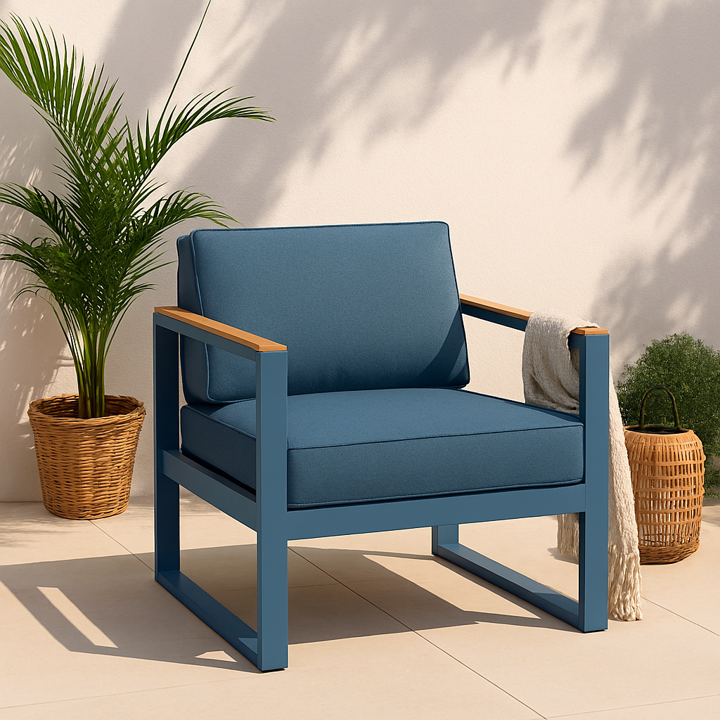 Fotel Casablanca Blue zachwyca harmonijnym zestawieniem materiałów: miękkie poduszki w odcieniu Garden 2843 wprowadzają ciepło i komfort, metalowy stelaż w kolorze RAL 5014 dodaje śródziemnomorskiego charakteru, a drewniane podłokietniki nadają całości ponadczasowego stylu.