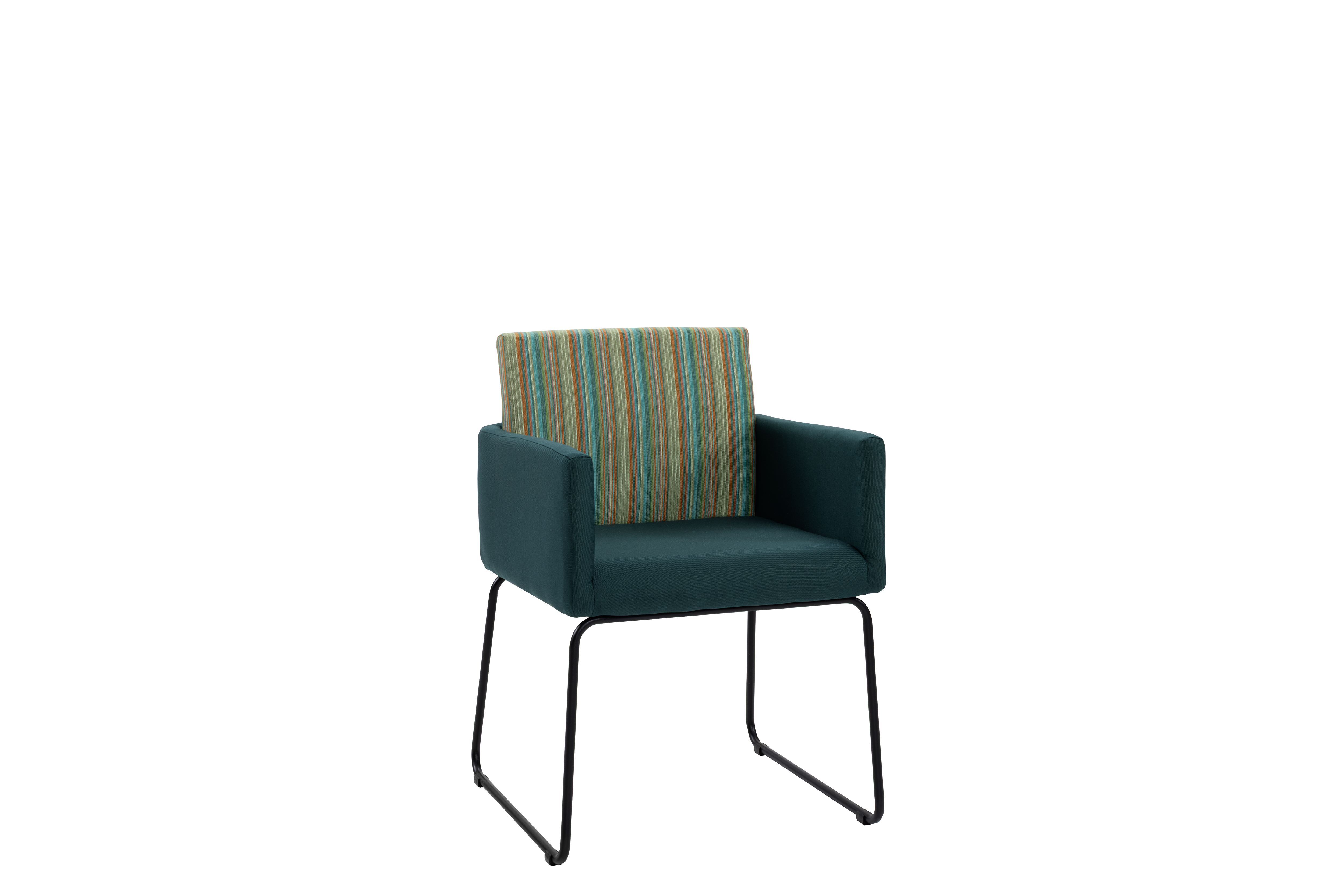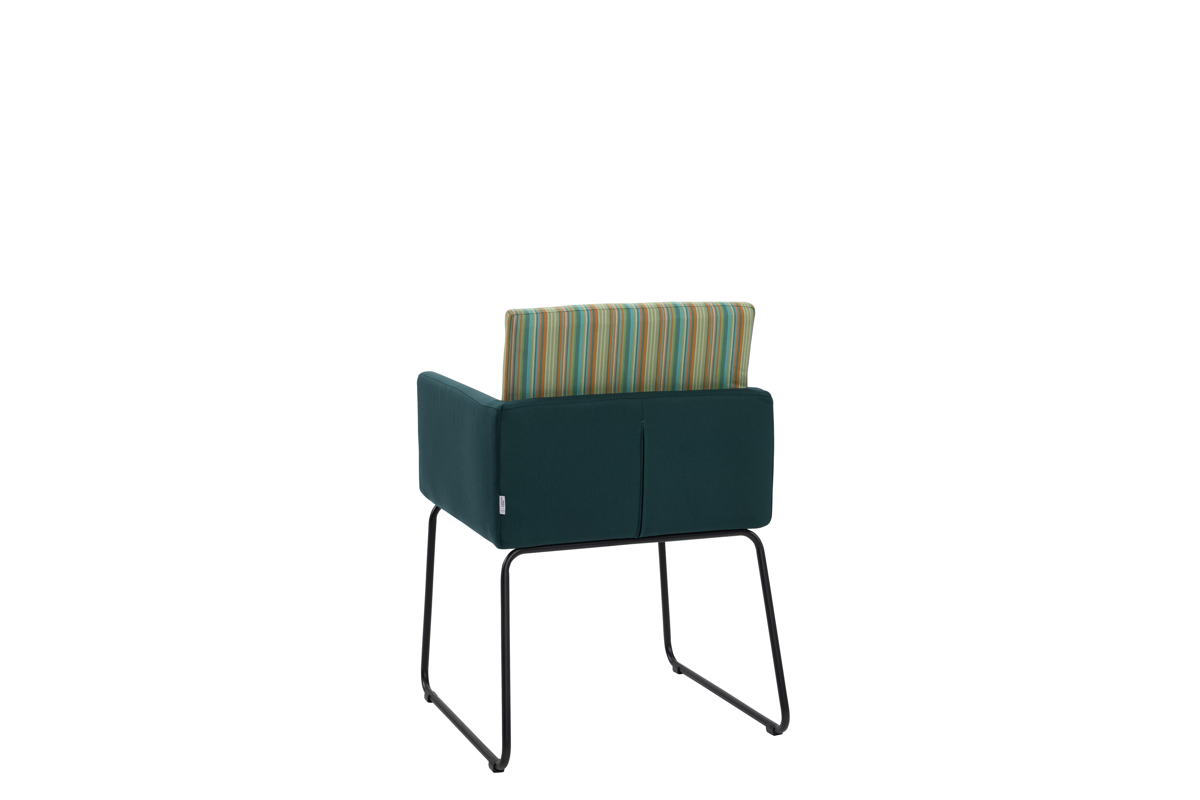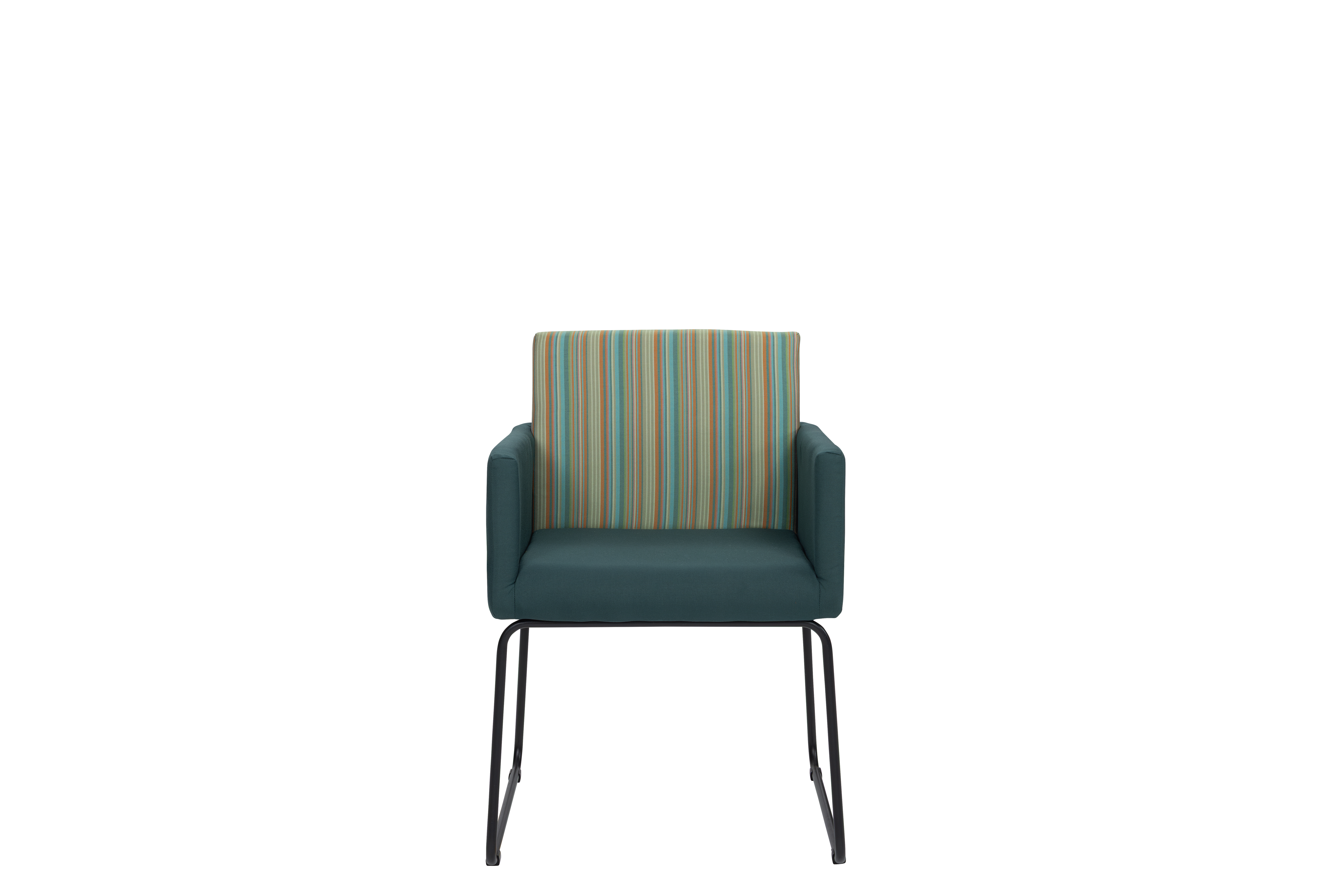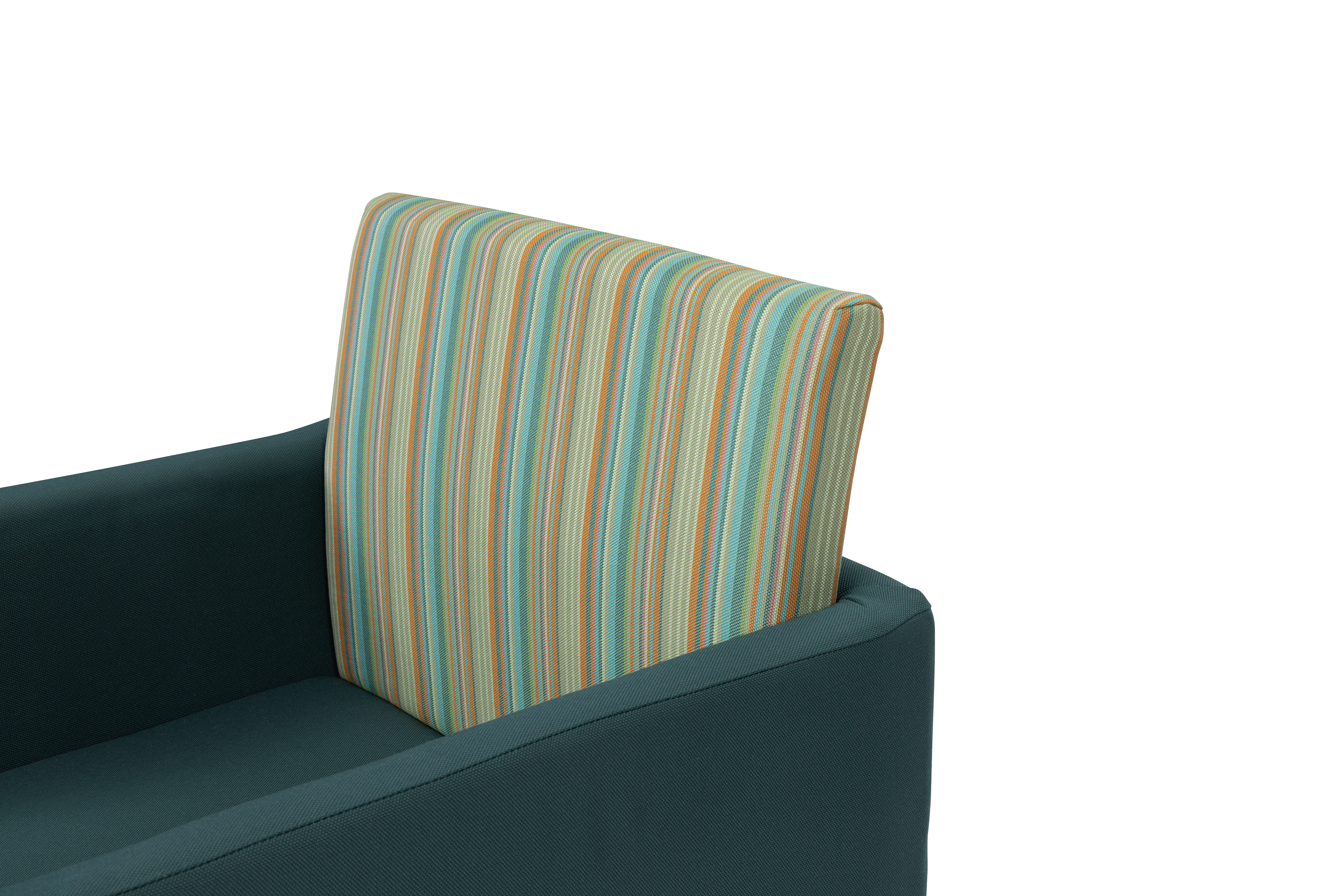 Siedzisko i oparcie zdobią dynamiczne pasy, natomiast podłokietniki pokryte są jednolitą, miękką tkaniną dla dodatkowego komfortu.