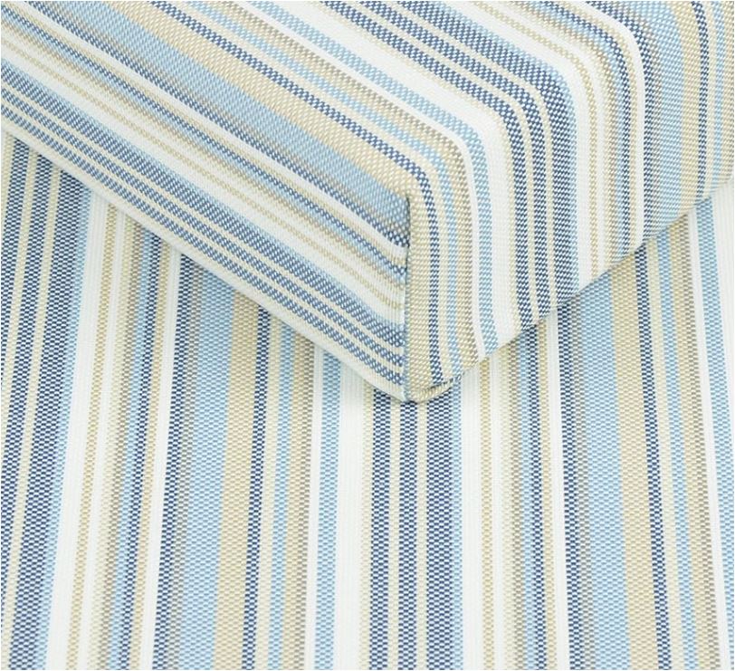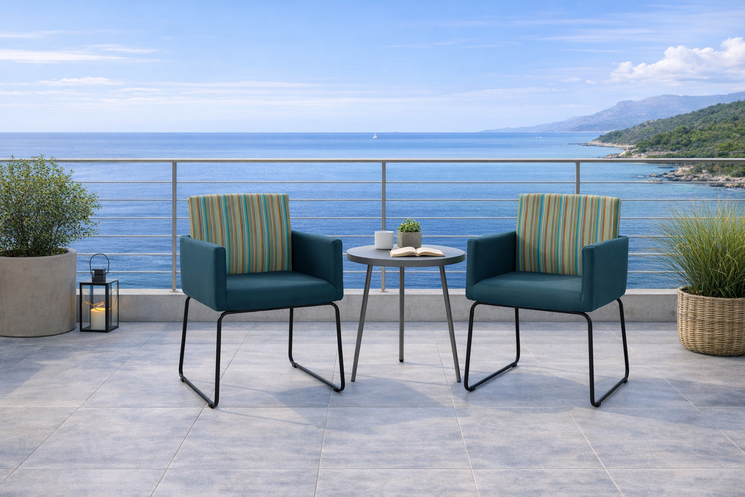 Krzesło ogrodowe Paris MODERN to stylowy i funkcjonalny mebel, idealny na taras, balkon lub do ogrodu. Tapicerka wykonana z tkanin outdoorowych marki Toptextil łączy wzorzyste pasy Bahama z gładkimi akcentami Kanaria, tworząc harmonijną kompozycję kolorystyczną w odcieniach błękitu, beżu i bieli.
